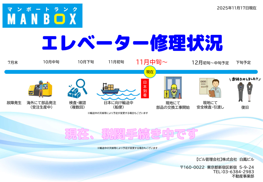 ご契約者様には、エレベーターが復旧するまでの間、階段をご利用いただくようお願い申し上げます。